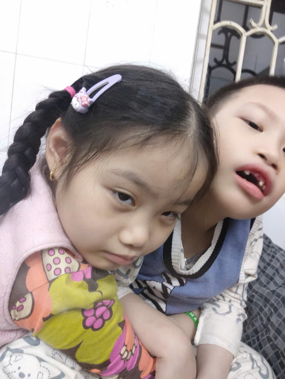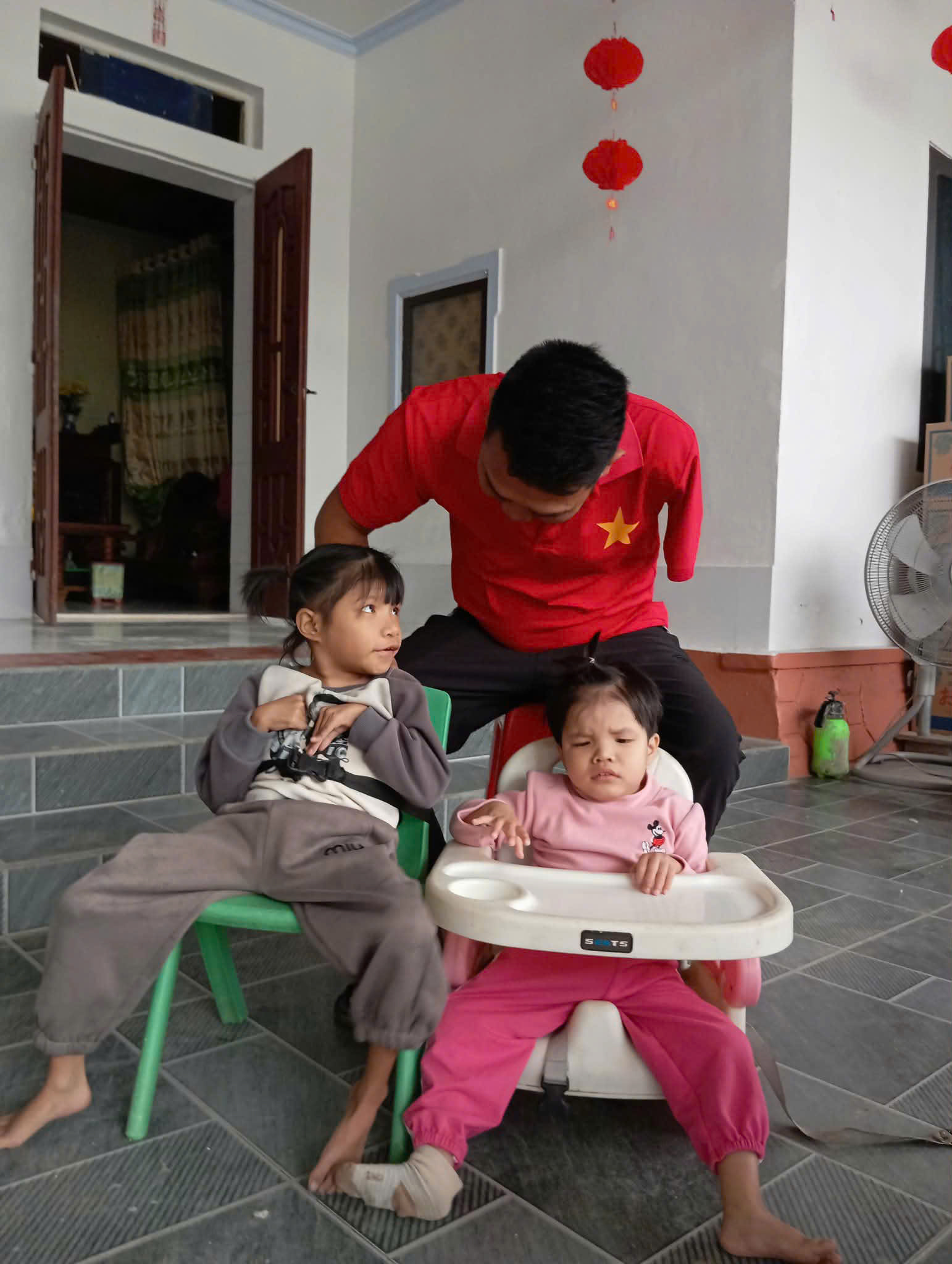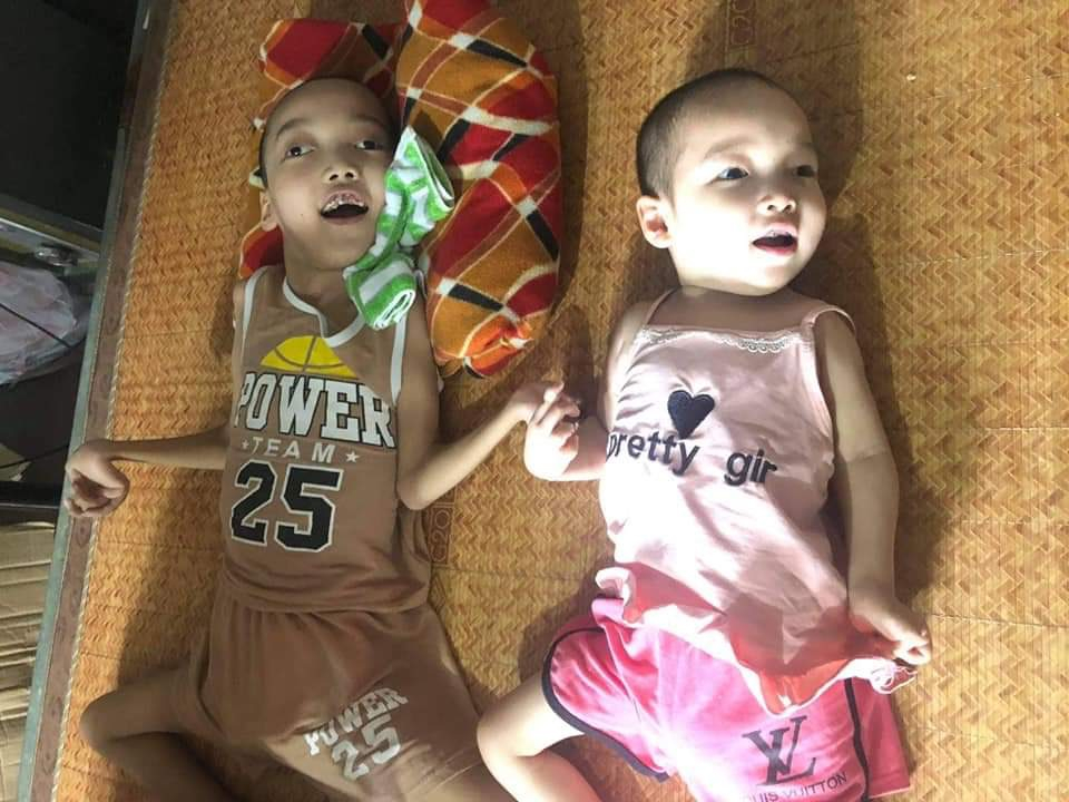 Hai em đều bị bại não. Bố các em đi làm thuê theo mùa, thu nhập không ổn định, mẹ ở nhà chăm sóc các con.
