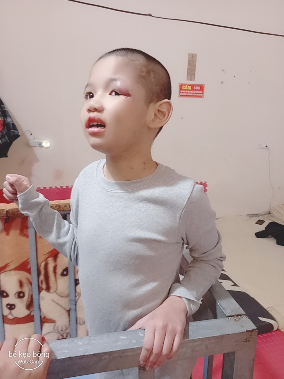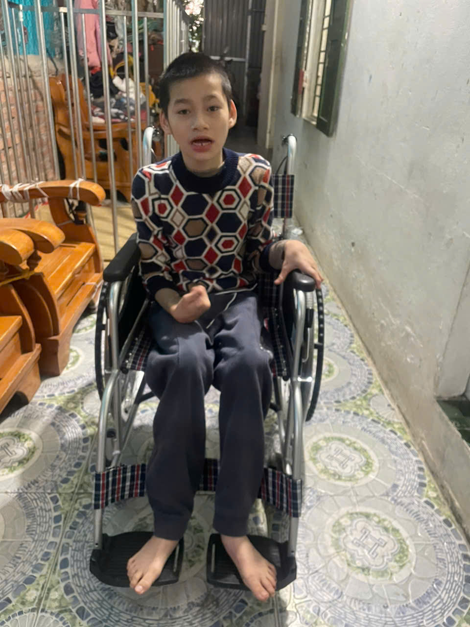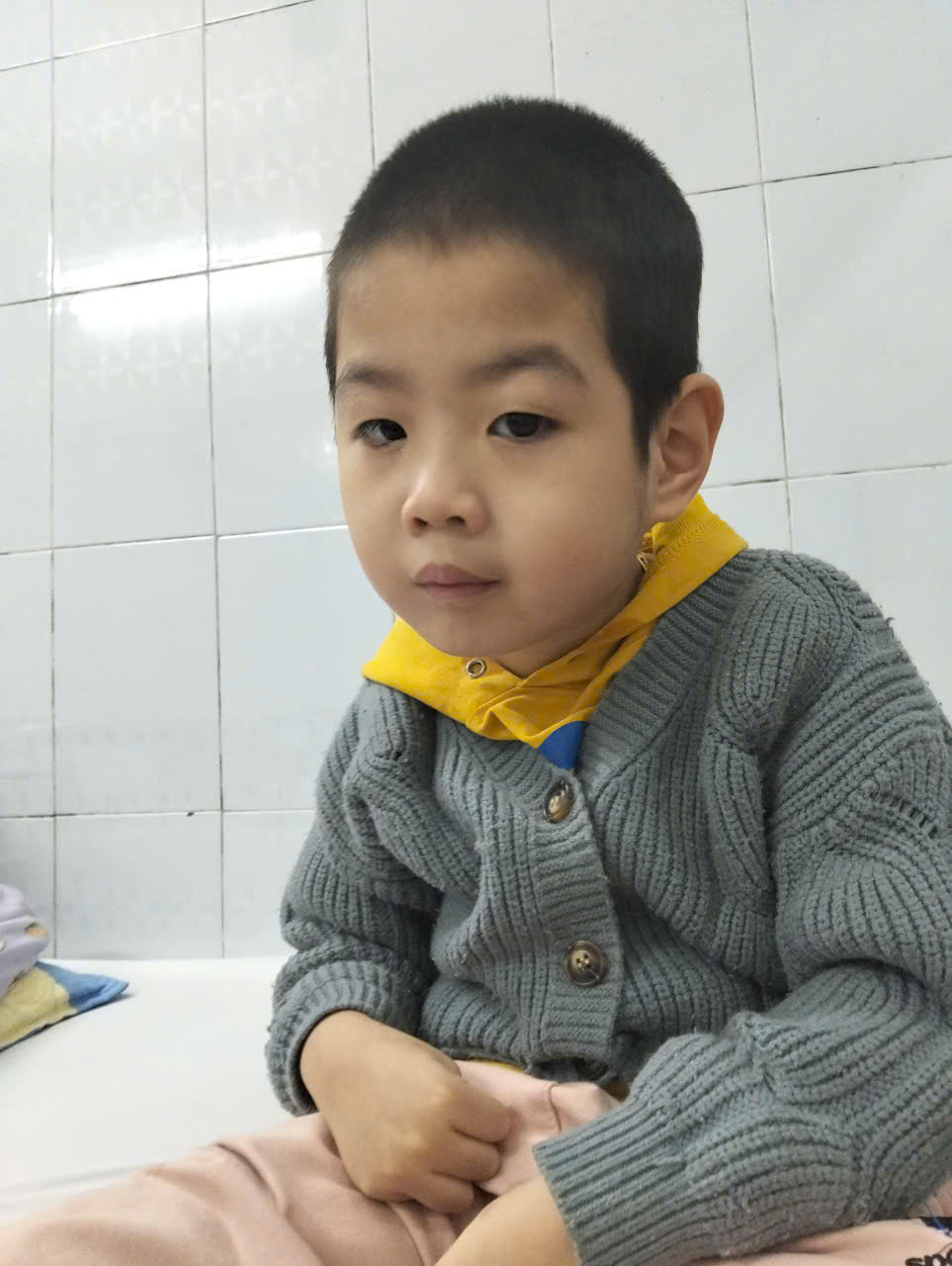 Em Thăng bị bại não. Bố em là bố đơn thân, một mình làm công nhân nuôi ba con. Hoàn cảnh gia đình khó khăn.