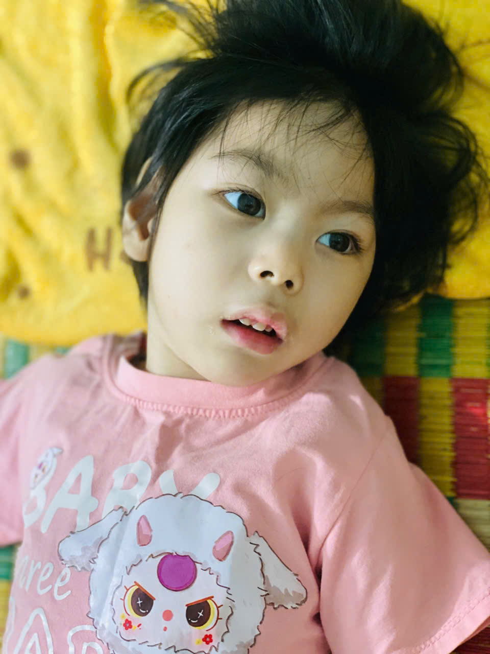 Em bị khuyết tật đặc biệt nặng, chỉ nằm 1 chỗ, không nói được. Chị gái em cũng bị bại não và đã mất tháng 6/2021. Bố mẹ em đã ly hôn, em sống cùng bà nội người dân tộc Nùng, bà không có việc làm ổn định. Gia đình thuộc hộ nghèo của địa phương.