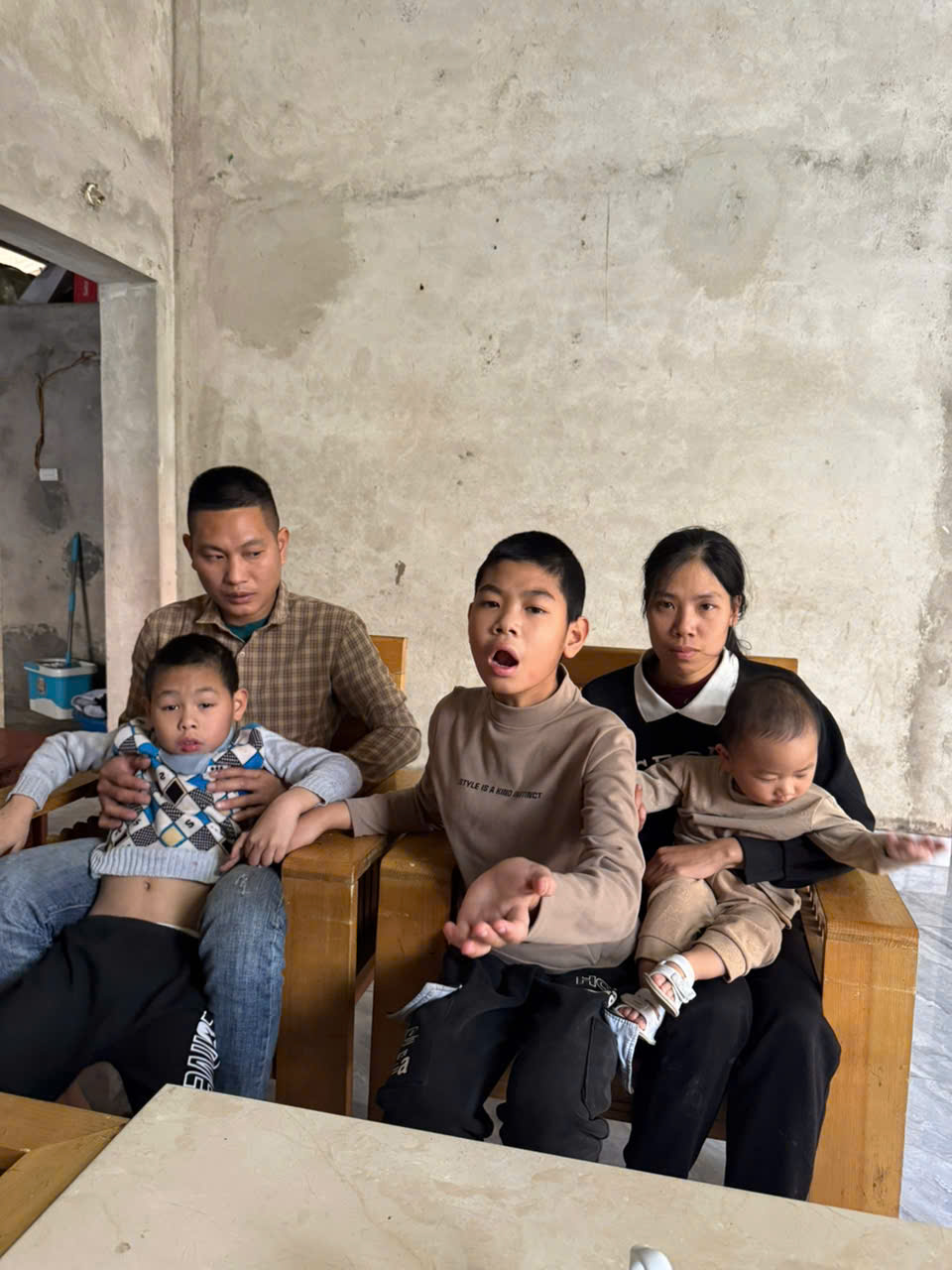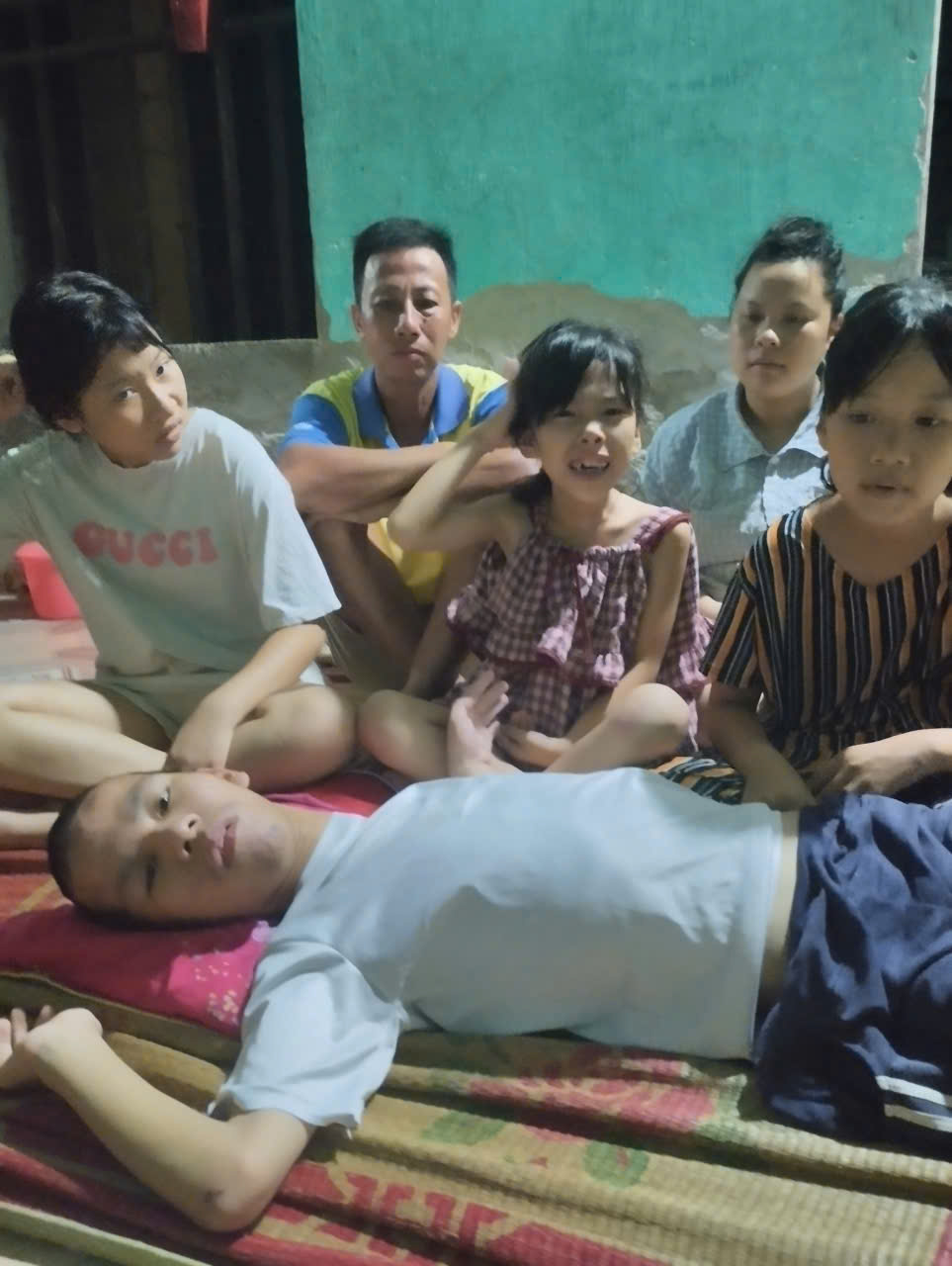 Gia đình có 5 người con thì cả 5 đều bị bệnh. Bố thần kinh không ổn định. Mẹ một mình chăm sóc, lo kinh tế cho cả gia đình. Gia đình thuộc hộ nghèo.
