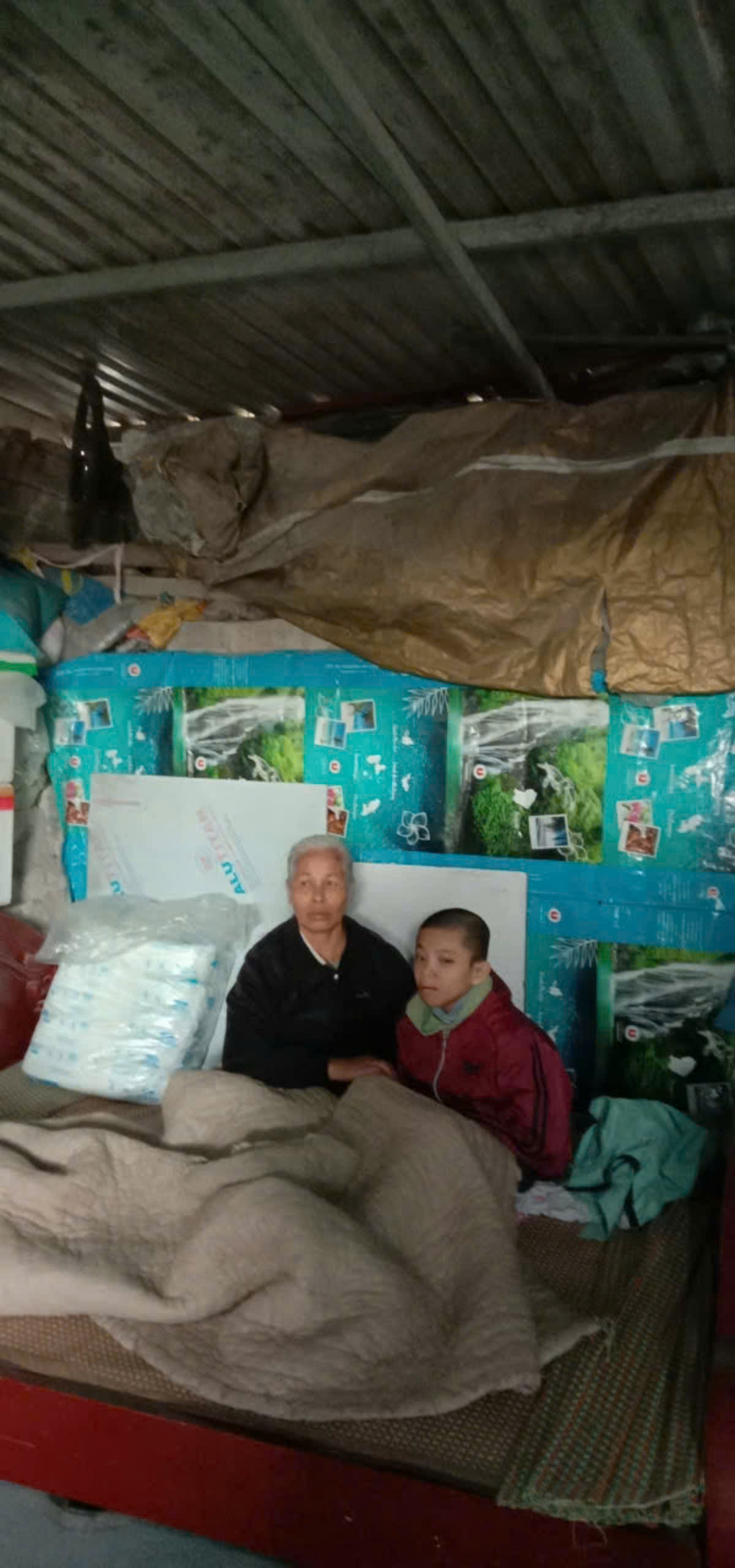 Em Tiến bị bại não nặng, chỉ nằm một chỗ. Bố em là lao động chính. Mẹ phải chạy thận hàng tháng, sức khỏe yếu. Gia đình thuộc hộ cận nghèo.