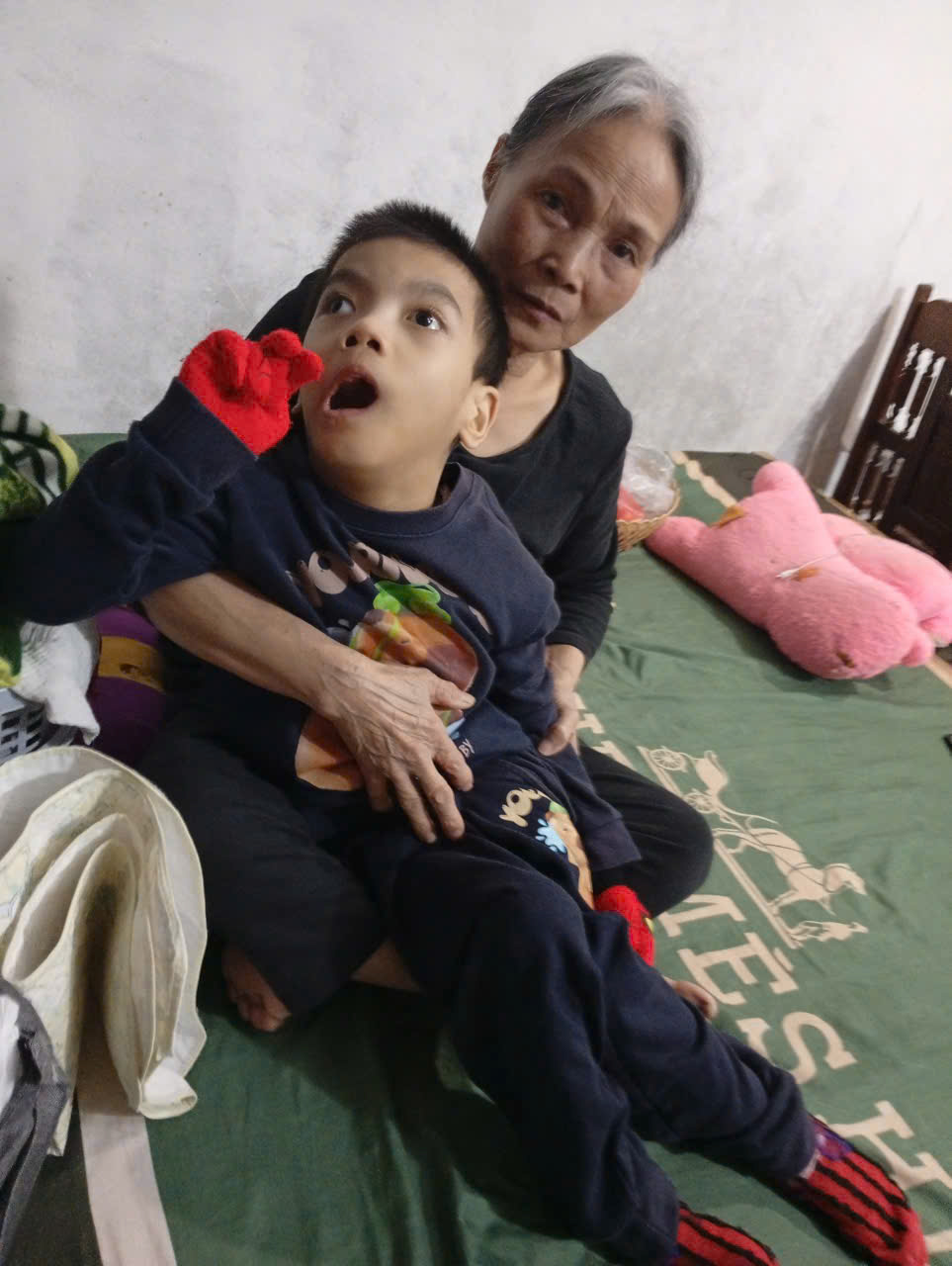Em bị bại não thể mềm, bà nội chăm nuôi, bố em đi lột vỏ cây rừng thỉnh thoảng mới về nhà, mẹ em thần kinh không bình thường đi lại nói nhảm.