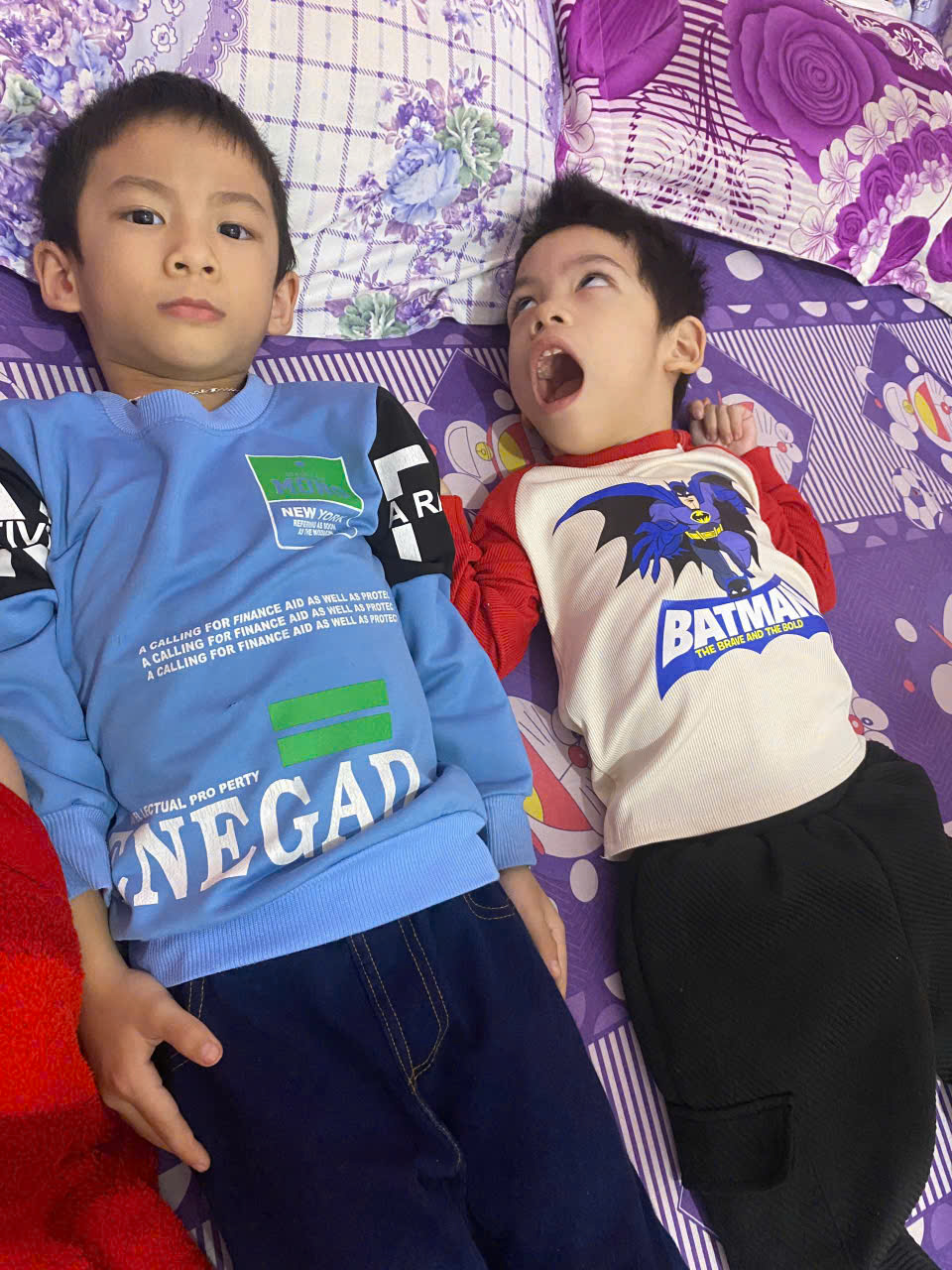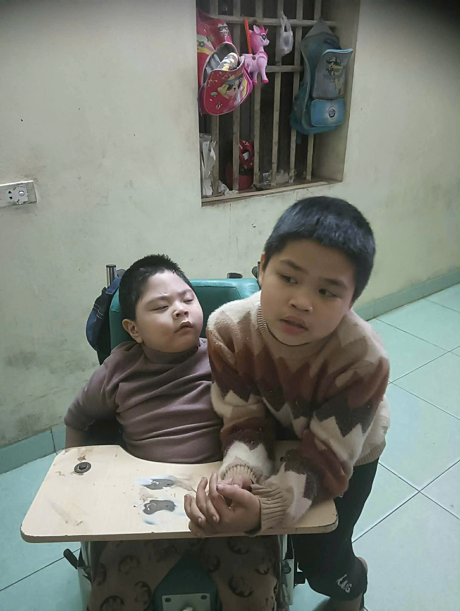 Hai anh em bị tổn thương não từ khi lọt lòng, mẹ các em là mẹ đơn thân một mình nuôi 2 con bị bại não. Hoàn cảnh gia đình vô cùng khó khăn, 2 anh em thường chơi với nhau vì chỉ có mình mẹ làm việc gồng gánh chăm nuôi, săn sóc 2 con.