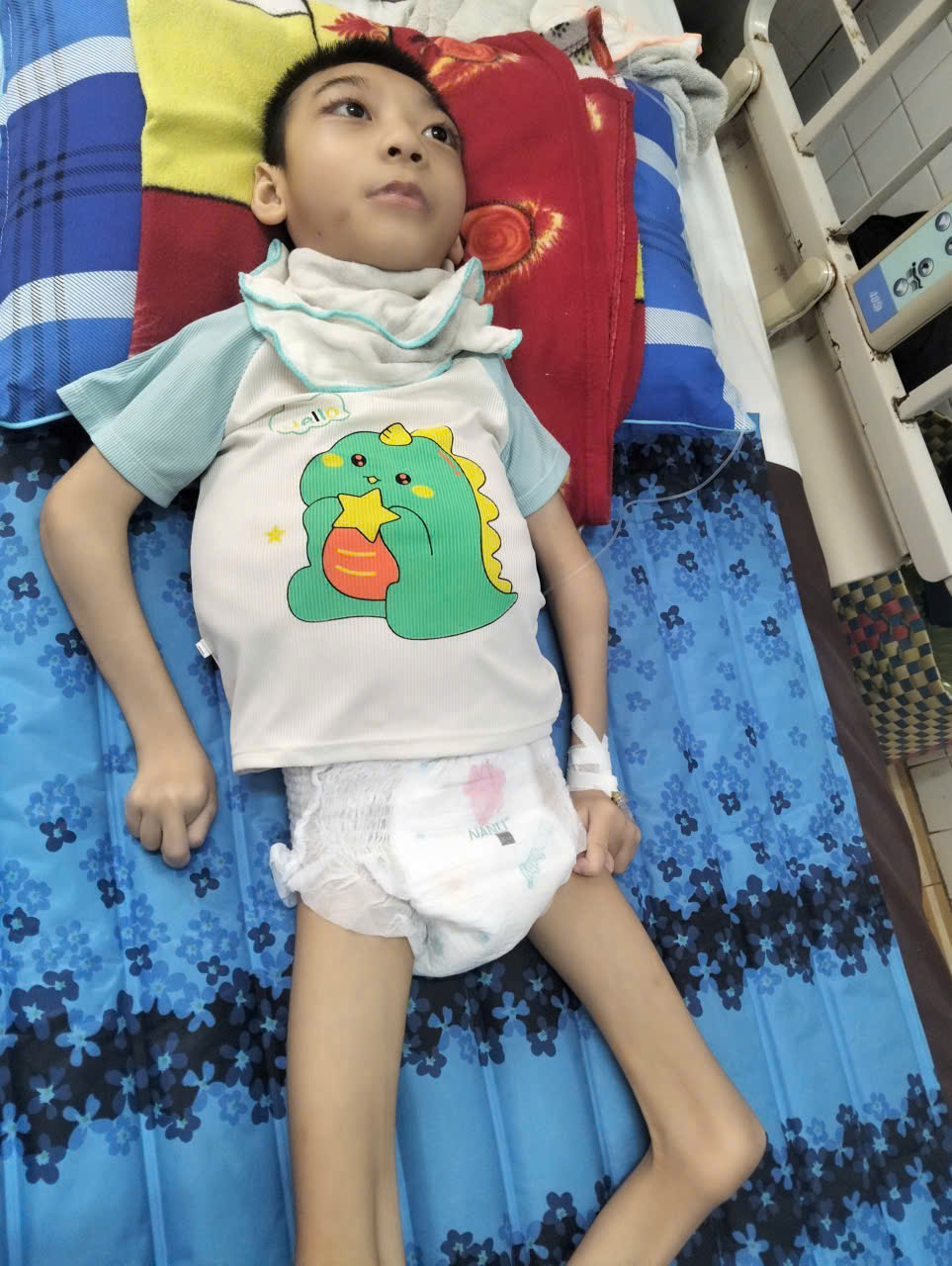 Bị bại não co cứng, Huy sinh năm 2018 và ở viện luôn cho đến nay chưa được về nhà. Hoàn cảnh nhà em lên tp.HCM thuê trọ, kinh tế khó khăn.