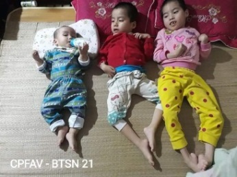 Huyền Trang và Quang Chiến bị bại não mức độ nặng chỉ nằm một chỗ. Gia đình mới sinh thêm bé Phúc Thịnh cũng không may tiếp tục bị chậm phát triển, hoàn cảnh gia đình vô cùng khó khăn khi chỉ có một mình bố con gồng gánh cả gia đình 3 con bị bệnh.