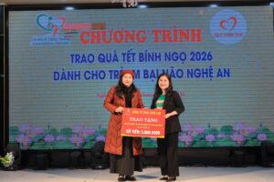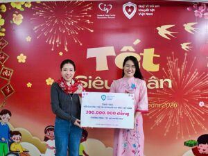 Chị Nguyễn Thùy Chi – Phó Chủ tịch thường trực CPFAV đón nhận biểu trưng 600 phần quà Tết (tương đương 360 triệu đồng) Quỹ Thiện Tâm dành cho Hội Gia đình trẻ em và người bại não Việt Nam nhân dịp Tết Bính Ngọ 2026
