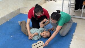 CN.PHCN Nguyễn Thị Hường – Trung tâm Flame cơ sở Long Biên hướng dẫn các gia đình thực hành kỹ năng chăm sóc trẻ bại não tại nhà